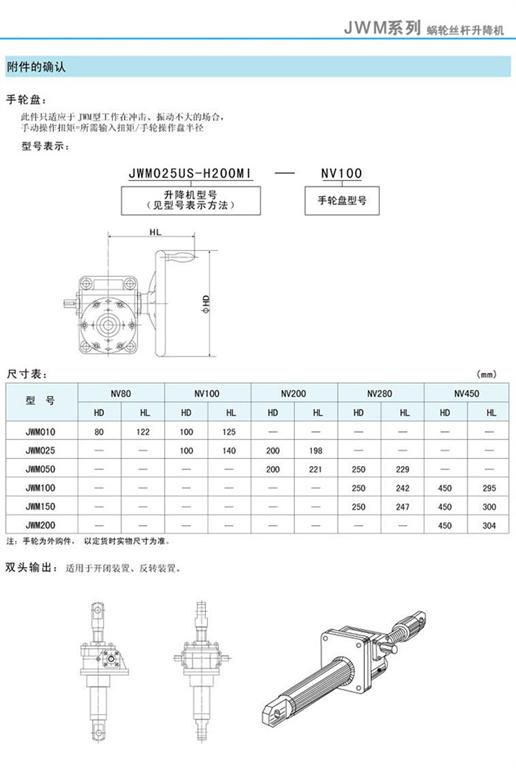 JWM絲桿升降機附件的確認-手輪盤、尺寸表及雙頭輸出