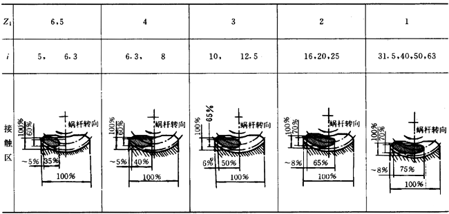 d.蝸輪齒面接觸區位置、大小應符合表8-128的規定。雙向運轉時,蝸輪輪齒兩側接觸區對稱對蝸輪中心平面。