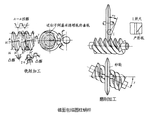 錐面包絡圓柱蝸桿螺旋面由錐面盤形銑刀或砂輪包絡而成,蝸桿軸線與刀具軸線在空間交叉成分度圓柱上的導程角。形成的齒廓在不同截面上成不同的曲線。齒廓形狀不但與蝸桿幾何參數(shù)有關,而且與刀盤直徑有關。